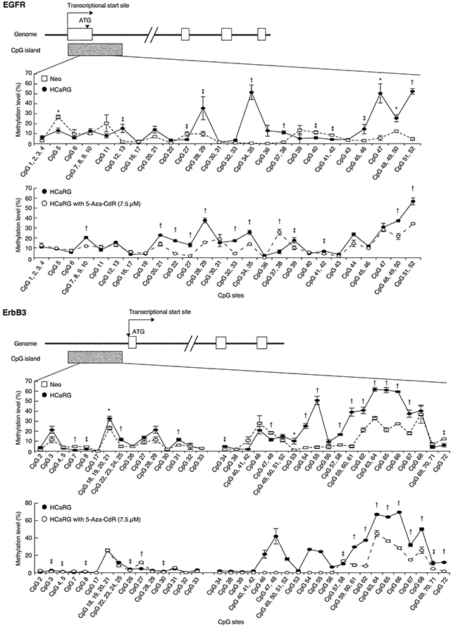 Figure 5: HCaRG fosters CpG island hyper-methylation of EGFR and ErbB3 promoters. Methylation level of CpG island located in EGFR and ErbB3 promoters was quantified using MassARRAY quantitative methylation analysis in Renca clones. Both EGFR and ErbB3 promoters showed significantly higher methylation levels in HCaRG-Renca cells than in Neo-Renca cells. Several hyper-methylated CpG sites located in EGFR and ErbB3 promoters in HCaRG-Renca cells were de-methylated 72 hours after treatment of 5-Aza-CdR. ‡P < 0.05, *P < 0.01, †P < 0.005.