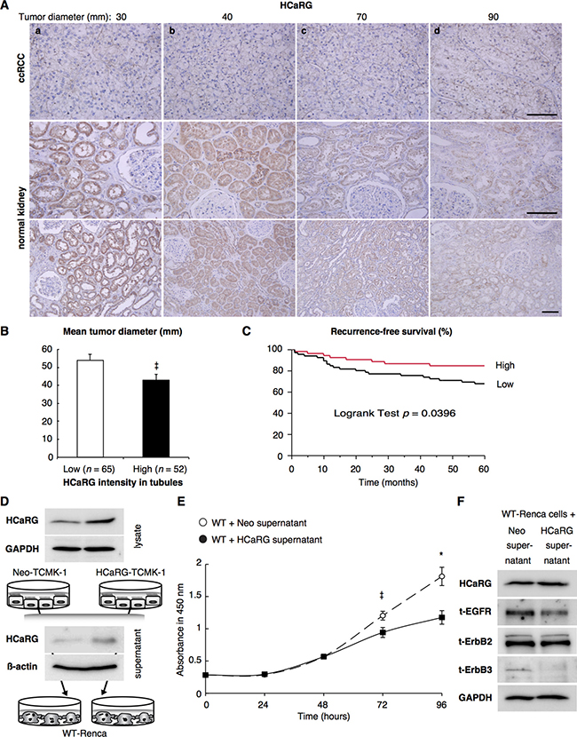 Figure 6: HCaRG is less expressed in human ccRCCs than in normal renal tubules. (A) Representative HCaRG immunohistochemical staining was performed on sections that included not only ccRCC (upper panels) but also normal kidney tissues adjacent to tumors. Strong HCaRG intensity was recorded in normal kidneys adjacent to smaller ccRCCs (maximum tumor diameter 30 and 40 mm) as in a and b. HCaRG staining intensity was weak in ccRCCs and renal tubules from patients with larger tumor size (maximum tumor diameter 70 and 90 mm) as in c and d. Scale bars, 100 μm. (B) High HCaRG levels in normal renal tubules were associated with small tumor size of ccRCCs (‡P < 0.05). Patients were classified into high and low HCaRG levels in renal tissues adjacent to tumors. (C) 5-year recurrence-free survival curves of ccRCC patients. High HCaRG levels in normal renal tubules are a predictor of better prognosis. (D) Total (exogenous and endogenous) HCaRG protein levels in cell lysates and acetone-precipitated supernatants of culture media from mouse kidney epithelial cells, TCMK-1 clones, revealed by western blot, were higher in HCaRG-TCMK-1 cells than in Neo-controls. HCaRG protein was secreted by renal tubular epithelial cells. (E) Cell growth curve of WT-Renca cells incubated with cell-culture supernatant from Neo-TCMK-1 or HCaRG-TCMK-1 cells. Cell proliferation of WT-Renca cells incubated with cell-culture supernatant of HCaRG-TCMK-1 cells was inhibited compared to cells incubated with cell-culture supernatant of Neo-TCMK-1 cells. ‡P < 0.05, *P < 0.01. (F) WT-Renca cells were incubated in cell-culture supernatant of Neo- or HCaRG-TCMK-1 cells for 96 hours. The cell-culture supernatant from HCaRG-TCMK-1 cells reduced the protein levels of EGFR and ErbB3 compared to cells incubated in cell-culture supernatant of Neo-TCMK-1 cells. Endogenous HCaRG and ErbB2 expression levels were not changed by these cell-culture supernatants.