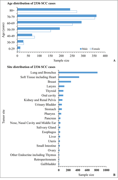 Figure 1: The distribution of age (A) and primary tumor location (B) of all SpCC cases registered in the SEER database.