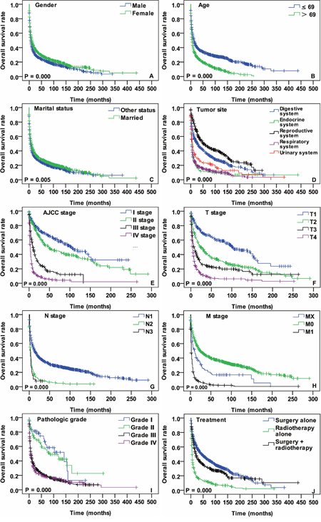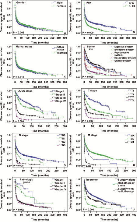 Figure 3: DSS curves of cases with SpCC compared according to (A) gender, (B) age, (C) marital status, (D) tumor location, (E) AJCC stage, (F) T stage, (G) N stage, (H) M stage, (I) pathologic grade and (J) treatment modalities. Log-rank test was utilized to compare curves, and significance is presented on each panel.