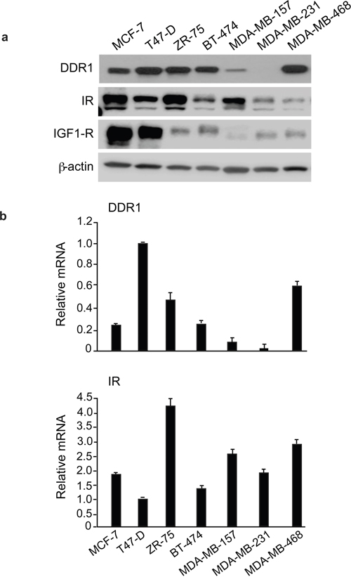 We first evaluated by immunoblot the expression of DDR1 and IR in a panel of human breast cancer cell lines (MCF-7, T47D, ZR-75, BT-474, MDA-MB-157, MDA-MB-231, MDA-MB-468). Both molecules were expressed at variable levels with the highest DDR1 levels observed in MCF-7, T47D, ZR-75, BT-474 and MDA-MB-468, and the highest IR levels observed in MCF-7, ZR-75 and MDA-MB-157 cells (Figure 1a). DDR1 and IR mRNA expression, measured by quantitative real-time RT-PCR (qRT–PCR), was generally in good agreement with the immunoblot results (Figure 1b).