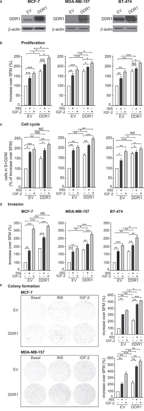 We next evaluated whether DDR1 expression could modulate the biological effects of insulin and IGF-2 in breast cancer cells. Indeed, in all three breast cancer cell lines, MCF-7, MDA-MD-157 and BT-474, DDR1 silencing by a pool of four specific siRNA oligos (Figure 3a) was associated with marked inhibition of cell viability as assessed by the MTT assay (Figure 3b) and cell cycle progression (Figure 3c), both in unstimulated cells and after treatment with either insulin or IGF-2. DDR1 silencing additionally inhibited other protumorigenic actions of insulin and IGF-2, such as cell invasion through fibronectin-coated filters (Figure 3d) and colony formation in semi-solid agar (Figure 3e). Accordingly, transient DDR1 overexpression (Figure 4a) enhanced cell viability (Figure 4b), cell cycle progression (Figure 4c), cell invasion (Figure 4d), and colony formation (Figure 4e), both in unstimulated cells and after stimulation with either insulin or IGF-2. In our experimental conditions, BT-474 cells did not form colonies in soft agar with charcoal-stripped serum-containing media.