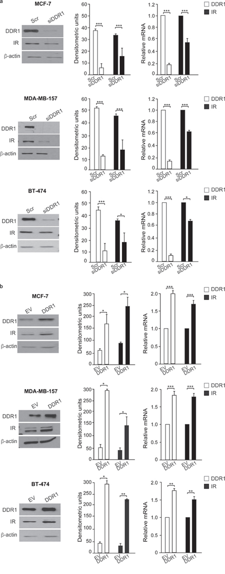 Figure 5: DDR1 affects IR expression. (a) IR protein and mRNA expression in DDR1-depleted cells. MCF-7, MDA-MB-157 and BT-474 breast cancer cells were transiently transfected with either a pool of four scramble or four DDR1 siRNA oligos. After 48h, cells were lysed and analyzed by SDS-PAGE and immunoblotted with the indicated primary antibodies. β-actin was used as control for protein loading. Blot is representative of three independent experiments. The histograms represent the mean±SEM of densitometric analysis after normalization against β-actin. In the same transfected cell lines, IR mRNA levels were evaluated by qRT-PCR analysis and values were normalized using human β-actin as housekeeping control gene. In parallel, DDR1 mRNA was evaluated by qRT-PCR to confirm DDR1 depletion (graphs on the right). (b) IR protein and mRNA expression after DDR1 overexpression. Breast cancer cells were transiently transfected with either constitutive empty (pCMV6-EV) or human DDR1 (pCMV6-DDR1) expressing vectors. After 48h, cells were lysed, analyzed by SDS-PAGE and immunoblotted with the indicated primary antibodies. β-actin was used as control for protein loading. The top panels show a representative blot of three independent experiments. The histograms represent the mean±SEM of densitometric analysis after normalization over β-actin. In the same transfected cells, IR mRNA levels were evaluated by qRT-PCR analysis and values were normalized using human β-actin as housekeeping control gene. The overexpression of DDR1 was confirmed measuring DDR1 mRNA by qRT-PCR (graphs on the right). (a-b) *0.01 < p < 0.05; *0.01 < p < 0.05; **0.001 < p < 0.01; ***p < 0.001; (scramble vs. siDDR1 and EV vs. DDR1 and transfected cells). statistical significance was calculated using Student’s t-test.
