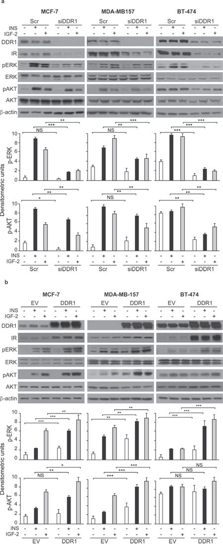Figure 6: DDR1 depletion or overexpression affects insulin and IGF-2 downstream signaling in human breast cancer cells. (a) Insulin and IGF-2 signaling after DDR1 depletion. MCF-7, BT-474 and MDA-MB-157 breast cancer cells were transiently transfected with a pool of four scramble or of four siRNA oligos against DDR1. After 48h, cells were grown in medium containing 2.5% of CS-FCS for 24h and then stimulated with or without 10nM of insulin or IGF-2 for 5 minutes. Cells were then lysed and analyzed by SDS-PAGE and immunoblotted with the indicated primary antibodies. β-actin was used as control for protein loading. The top panels show a representative of three experiments. The histograms represent the mean±SEM of densitometric analysis of three independent experiments after normalization of each phosphoprotein against β-actin. (b) Insulin and IGF-2 signaling after DDR1 overexpression. MCF-7, BT-474 and MDA-MB-157 breast cancer cells were transiently transfected with plasmids encoding either the human DDR1 cDNA (pCMV6-DDR1) or the corresponding empty vector (pCMV6-EV). After 48h, cells were grown in medium containing 2.5% of CS-FCS for 24h and then stimulated with or without 10nM of insulin or IGF-2 for 5 minutes. The activation of downstream signaling was assessed as in (a). Blots are representative of three independent experiments. The histograms represent the mean±SEM of densitometric analysis of three independent experiments after normalization of each phosphoproteins against β-actin. (a-b) NS, p > 0.05; *0.01 < p < 0.05; **0.001 < p < 0.01; ***p < 0.001; statistical significance was calculated using one-way ANOVA followed by Bonferroni test.