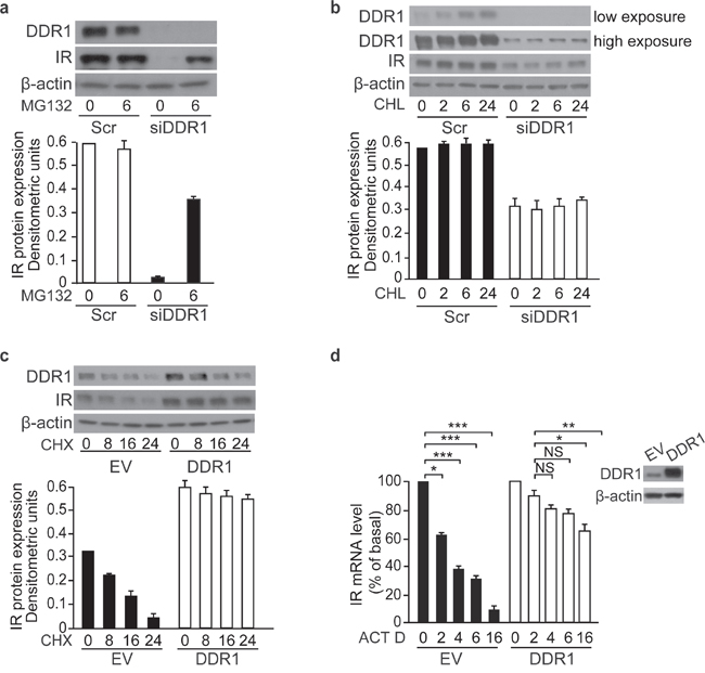 Figure 7: DDR1 stabilizes IR both at the protein and mRNA level in MCF-7 cells. (a) DDR1 depletion affects IR proteasomal degradation. MCF-7 cells were transiently transfected with either a pool of four scramble or four DDR1-specific siRNA oligos. After 48h, cells were treated with 1μM of the proteasome inhibitor MG132 for 6h. (b) DDR1 depletion does not affect IR lysosomal degradation. MCF-7 cells were transiently transfected as in (a). After 48 h, cells were treated with 10μM of the cloroquine (CHL) for 2, 6, and 24h. (c) Cycloheximide treatment in DDR1 overexpressing cells. MCF-7 cells were transiently transfected with either pCMV6-EV or pCMV6-DDR1 encoding vectors. After 24 h, cells were treated with 100 μM of cycloheximide (CHX) for 8, 16, and 24h. (d) Actinomycin D treatment in DDR1 overexpressing cells. MCF-7 cells were transiently transfected as in (c). After 24h, cells were treated with 2.5μg/mL of actinomycin D (ACT D) for 2, 4, 6, and 16h. IR mRNA levels were evaluated by qRT-PCR analysis and values were normalized using human β-actin as housekeeping control gene. DDR1 overexpression was confirmed by western blot analysis as shown on the right of the histogram. (a-c) Samples were analyzed by western blotting for DDR1 and IR expression. β-actin antibody was used as control. A representative blot of three independent experiments is shown. The histogram represents the mean±SEM of densitometric analysis after normalization against β-actin. (a-d) NS, p > 0.05; *0.01 < p < 0.05; **0.001 < p < 0.01; ***p < 0.001. Statistical significance was calculated using Student’s t-test.
