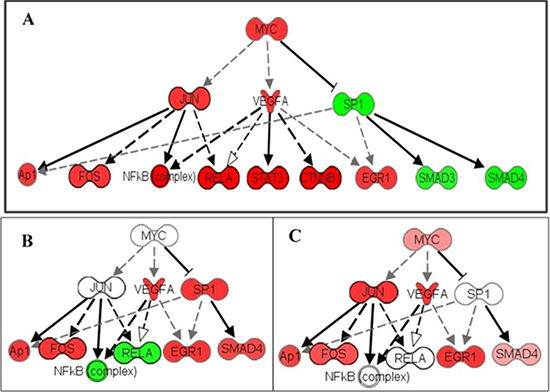 Figure 1: Heterogeneity of MYC pathway activation in cancer. The MYC pathway is activated in a patient with HNSCC by analysis of the cell lysate. MYC pathway activation was also detected in single CCR5+ breast cancer cells. (A) RNA-seq of a HNSCC lysate shows activation of multiple members in the MYC pathway. (B) Single-cell RNA-seq shows activation of MYC members through VEGFA and SP1. (C) Another single-cell RNA-seq shows activation of the MYC pathway through JUN and VEGFA. This heterogeneity of MYC pathway activation could explain why target therapies based on cell lysate results are often not effective or fail to control the cancers which contain multiple activation patterns of the MYC pathway. Red: upregulation; Green: down-regulation. Up- or down-regulation are calculated with fold difference of expression level cancer lysate/non-cancer lysate or cancer single cell/normal single-cell respectively. Darker color indicates higher fold changes.