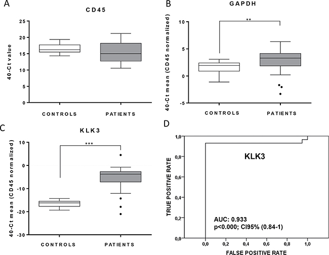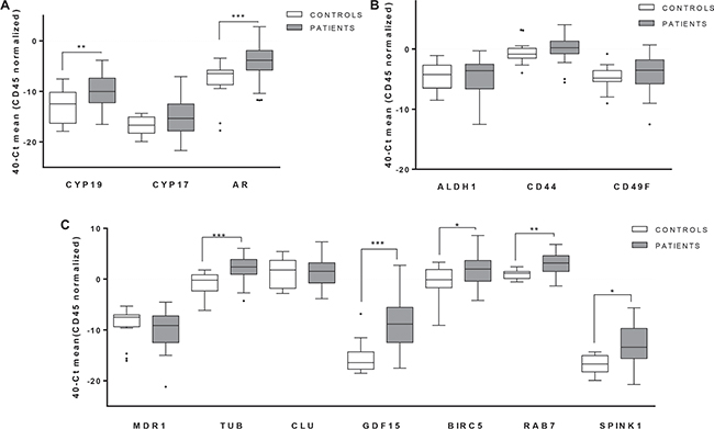 The assay included the following 15 relevant genes for PCa progression: AR, CYP19 and CYP17 because they are genes implicated in androgen-pathway regulation that plays a critical role in prostate cells biology [38, 39]; CD133, CD44, ALDH1A, ABCG2 and CD49f as genes related to stem cell phenotype associated to intrinsic therapeutic resistance against androgen-blockage and chemotherapy [40, 41] and previously described as relevant for CTCs molecular features [42]; and BIRC5, CLU, GDF15, RAB7A, SPINK1, TUB1A, MDR1 that are genes implicated in PCa aggressiveness and/or resistance to taxanes [34–37, 43–45] and, therefore, highly interesting markers to be analyzed in the CTCs population from mCRPC patients. The house-keeping gene GAPDH as total cellular load marker was analyzed to detect the presence of an additional cell population in the blood of patients as described previously [23, 46] and demonstrated in the present study by spiking experiments using PC3 cells (see Supplementary Figure 1). Probe characteristics are detailed in Supplementary Table 1. Data were analyzed using StepOne Software v.2.1. (Applied Biosystems). Mean threshold cycle (depicted as 40-Ct) for every candidate gene was normalized to CD45 that allows the quantification of non-specific isolation and that have been previously used to discriminate the population of CTCs from the total of nucleated cells isolated after the immunoenrichment step [23, 46, 47]. Samples were run in duplicate and all plates included negative controls. The protocol was also applied to healthy volunteer’s blood for subtracting the unspecific background.