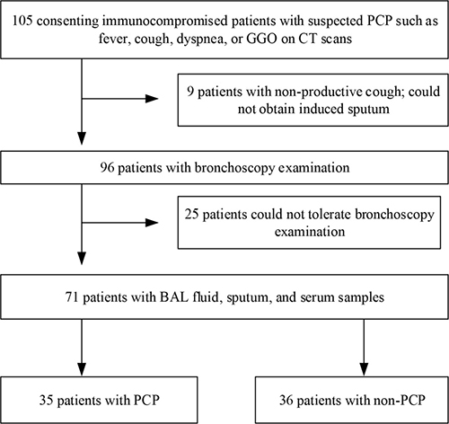 One hundred and five immunocompromised patients were recruited for this study from January 2015 to November 2016. Thirty-four of these were excluded due to either unavailable induced sputum or infeasible bronchoscopy procedure. As a result, 71 patients were enrolled; of these, 35 were clinically diagnosed with PCP while 36 had a non-PCP diagnosis (Figure 1). Among the 35 patients with clinical PCP, 18 were defined as PCP with positive GMS staining (10 with positive BAL fluid staining, 4 with positive sputum staining, and 4 with positive BAL fluid and sputum staining). Among the 36 non-PCP patients, 1 was diagnosed with pulmonary embolism, 1 was diagnosed with lung cancer, 2 were diagnosed with interstitial pneumonia, and 32 were diagnosed with as severe pneumonia (9 viral pneumonia, 17 bacterial pneumonia, and 6 fungal pneumonia, other than PCP).
