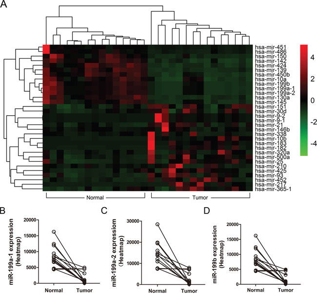 Figure 1: Heatmap analysis of miRNA expression in human HCC patient samples. (A) The heatmap analysis was performed by R software with DESeq package (p <0.05 and log2 fold change >1) to illustrate miRNA expression profiles in 15 HCC cases and matched normal liver tissues. (B-D) The expression levels of miR-199a-1, miR-199a-2, miR-199b in HCC tumor and normal liver tissues based on the heatmap miRNome profiles for 15 HCC patient samples (tumor and adjacent normal liver tissues).