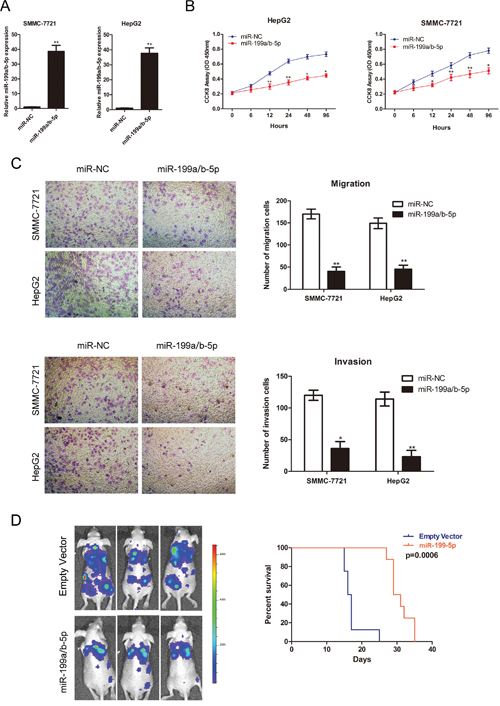 Figure 3: MiR-199a/b-5p overexpression reduces HCC proliferation and metastasis. (A) The relative expression of miR-199a/b-5p in SMMC-7721 and HepG2 cells transfected with 80nM miR-199a/b-5p mimics (1:1) or control. (B) Estimation of cell proliferation in SMMC-7721 and HepG2 cell lines transfected with control or miR-199a/b-5p mimics by cell counting kit-8 (CCK-8) assays. (C) Transwell assays determining cell migration and invasion potential of SMMC-7721 and HepG2 cell lines transfected with control or miR-199a/b-5p mimics. (D) In vivo xenograft tumor nude mice model determining the effects of miR199a/b-5p overexpression on HCC metastasis and mice survival. SMMC-7721 cells with control or stably overexpressed miR-199a/b-5p were injected into the caudal vein of mice and examined 14 days after cells implantation at the In Vivo Imaging System (IVIS). Kaplan-Meier survival curves of mice implanted with control or stably overexpressed miR-199a/b-5p SMMC-7721 cells are shown. The results are expressed as mean ± SD (*p<0.05, **p<0.01).
