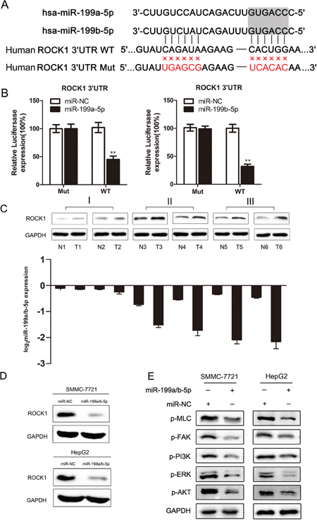 Figure 4: MiR-199a/b-5p post-transcriptionally inhibits ROCK1. (A) Targetscan analysis demonstrating that miR-199a/b-5p targets ROCK1 3’UTR sites. The schematic graph shows the putative binding sites of miR-199a/b-5p in the ROCK1 3’UTR and the mutations in the miR-199a/b-5p binding sites. (B) Relative luciferase activity in ROCK1 3’UTR wild-type (WT) and ROCK1 3’UTR mutant type (Mut) demonstrating that miR-199a/b-5pmimics downregulate luciferase activity from the wild-type ROCK1 3’UTR, but did not alter luciferase activity from the mutant ROCK1 3’UTR. (C) Expression of ROCK1 in representative stage I to stage III HCC tumor samples. The corresponding miR-199a/b-5p expression levels are shown below. (D) Western blot analysis of ROCK1 expression in SMMC-7721 and HepG2 transfected with miR-NC and miR-199a/b-5p mimics. (E) Western blot analysis of the ROCK1/MLC and PI3K/AKT signaling pathways in SMMC-7721 and HepG2 cell lines transfected with miR-NC or miR-199a/b-5p mimics. The results are expressed as mean ± SD (*p<0.05, **p<0.01).