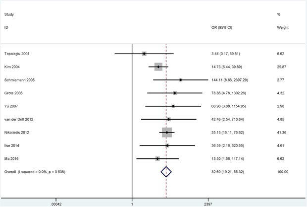 Figure 3: Forest plot showing the pooled OR between RASSF1A methylation and lung cancer in bronchial aspirates (980 lung cancer patients and 733 controls). OR = 32.60, 95% CI = 19.21 - 55.32, P < 0.001.