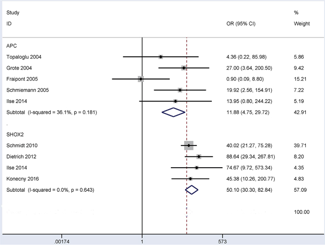 Figure 4: Forest plot indicating the overall OR between APC (360 patients with lung cancer and 273 controls) and SHOX2 (493 patients with lung cancer and 415 controls) methylation and lung cancer in bronchial aspirates. OR = 11.88, 95% CI = 4.75 - 29.72, P < 0.001 and OR = 50.10, 95% CI = 30.30 - 82.84, P < 0.001, respectively.