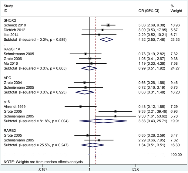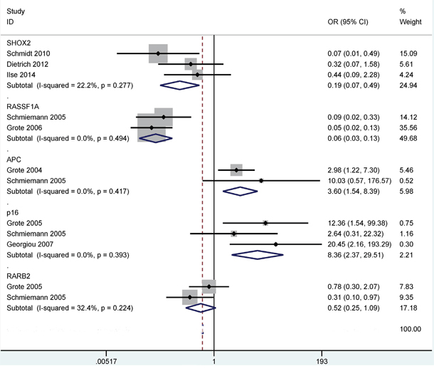 We conducted subgroup analyses regarding the P16 and RASSF1A genes to find variations in different ethnicities (Asians and Caucasians) and detection methods (methylation specific PCR (MSP) and quantitative methylation specific PCR (QMSP)) (Table 1).