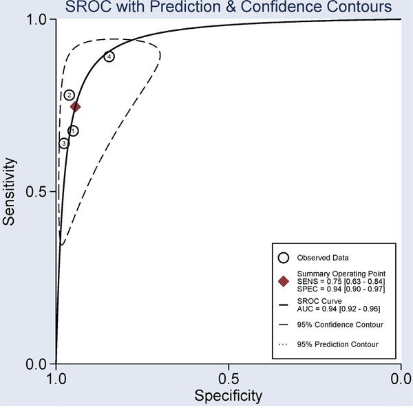 Figure 7: Summary receiver operating characteristics (SROC) evaluation for the potential diagnostic effect of the SHOX2 methylation using bronchial aspirates in lung cancer vs. non-tumor controls. Sensitivity = 0.75 (95% CI: 0.63-0.84), specificity = 0.94 (95% CI: 0.90-0.97), and area under the curve (AUC) = 0.94 (95% CI: 0.92-0.96), suggesting that SHOX2 methylation was a promising biomarker for lung cancer diagnosis (sensitivity = 0.75 > 0.5, specificity = 0.94 > 0.9, and AUC= 0.94 > 0.9).