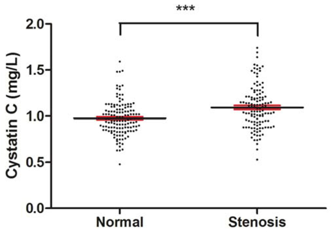 In summary, although further validation and evaluation in clinical settings are needed, the present findings showed that increased serum CysC was highly associated with large cerebral artery stenosis and was an independent risk factor of large cerebral artery stenosis in patients with AIS.
