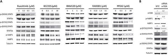 Figure 1: PI3K/mTOR inhibitors modulate phosphorylation pattern of STAT5. (A) pattern of phosphorylation of tyrosine and serine residues on STAT5a and STAT5b, respectively, and the effects of the JAK1 and JAK2 inhibitor ruxolitinib and of different inhibitors of the PI3K/mTOR pathway. BKM120 is a PI3K inhibitor, BEZ235 is a dual PI3K/mTOR inhibitor, RAD001 and PP242 are inhibitors of mTORC1 and mTORC1/2, respectively. SET2 cells were exposed for 24 h to increasing concentrations of the drugs and cell extracts were processed by western blotting analysis with indicated antibodies. A representative experiment of at least four. (B) Effects of mTOR silencing by specific siRNA on the levels of phosphorylated tyrosine and serine residues of STAT5a/b in SET2 cells. The mTORC1 target phospho-4eBP1 was used as a control of functional inhibition of mTORC1 signaling. Tubulin was used as loading control. Densitometric analysis was performed using ImageJ software. Data are from one representative experiment out of three.