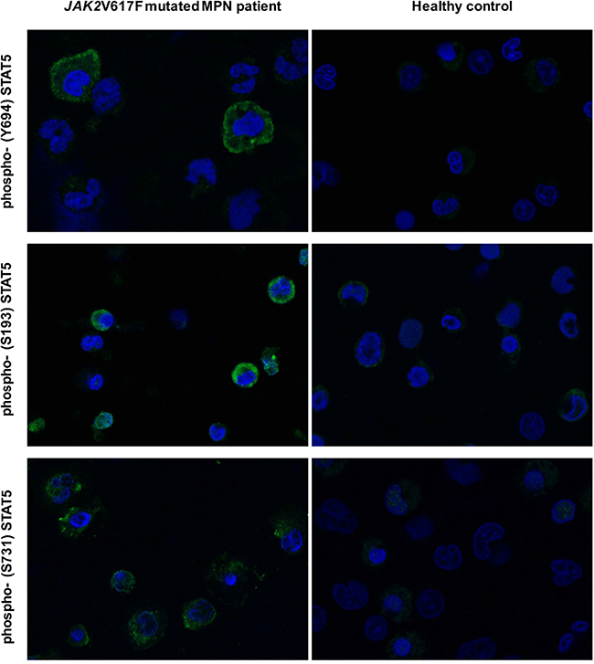 Granulocytes were isolated from JAK2V617F MPN patients. Fixed and permeabilized cells were incubated with relevant primary antibodies followed by anti-rabbit IgG Alexa Fluor-488 conjugated. Microscopic images were taken by a LSM 510 META Zeiss confocal microscope system (Carl Zeiss Inc., Jena, Germany) and analyzed by Confocor 2 (Zeiss) software (details in Supplementary Methods).