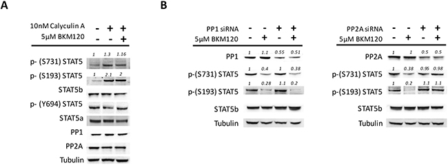 Figure 3: PP2A is involved in the de-phosphorylation of STAT5 serine residues in JAK2V617F mutated cells. (A) SET2 cells were pre-treated for 2 hours with the chemical phosphatase inhibitor Calyculin A (CA; 10 nM) before the addition of 5μM BKM120 for 24 hours. CA exposure resulted in increased phosphorylation of STAT5b serine residues and prevented their BKM120-induced de-phosphorylation, as opposite to STAT5a Y694 residue that remained unchanged. (B) Specific siRNAs were used to silence, although only partially, either PP1 or PP2A to dissect their unique role in the BKM120-induced de-phosphorylation of S731 and S193 of STAT5b. Tubulin was used as loading control. One of 5 different experiments is shown. Densitometric analysis was performed using ImageJ software.