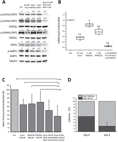 Figure 5: Effects of combining BKM120, RAD001 and ruxolitinib (triple drug combination) in different MPN models. (A) SET2 cells were exposed to suboptimal amounts of BKM120, RAD001 and ruxolitinib as single drugs (see Figure 1 for comparison), or in combination, and the effects on the phosphorylation of S731, S193 and Y694 of STAT5 and of 4eBP1, and the levels of CIP2A, were assessed by western blotting. (B) The mRNA amount of the STAT5 target gene Bcl-2 was assessed in SET2 cells treated with single drugs or drug combination by qRT-PCR. (C) Bone marrow mononuclear cells isolated from 6 JAK2V617F patients were plated in semisolid medium in presence of single agents or in combinations at two different dose levels. Colony formation was expressed as percent of the number of colonies enumerated in control dishes (no drug). (D) Bone marrow cells of JAK2V617F KI and wild type mice were mixed in a 1:1 ratio and plated in semisolid medium in the presence of BKM120 plus RAD001 and ruxolitinib, 30 nM each. Individual colonies harvested at day 4 of culture (to avoid colonies overlapping) were genotyped by allele specific PCR. All P values were determined by unpaired two-tailed Student’s T test and confirmed by BootstRatio test on fold change data (*P < 0.05, **P < 0.01).