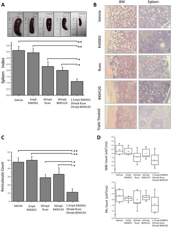 Figure 6: Efficacy of BKM120, RAD001 and ruxolitinib, single or in triple combination, in JAK2V617F knock-in mice. Animals received treatment for 16 days before sacrifice; control mice received vehicle only with the same schedule as treated ones. 10 mice for each treatment cohort were analyzed. (A) Effects of triple treatment on spleen size (upper panel) and spleen index (calculated as ratio of spleen and body weight x100) compared to other treatment groups and controls. (B) Histopathology of the spleen and bone marrow in control and treated mice. Picture were taken with a LEICA DM LS2 microscope using a N-Plan × 20 objective. (C) The number of reticulocytes per 10 high power fields in peripheral blood smears. (D) The number of white blood cells and platelets in the peripheral blood of mice treated with drugs combination; values in mice receiving each single drug were comparable to controls and are not shown. All P values were determined by unpaired two-tailed Student’s T test and confirmed by BootstRatio test on fold change data (*P < 0.05, **P < 0.01).