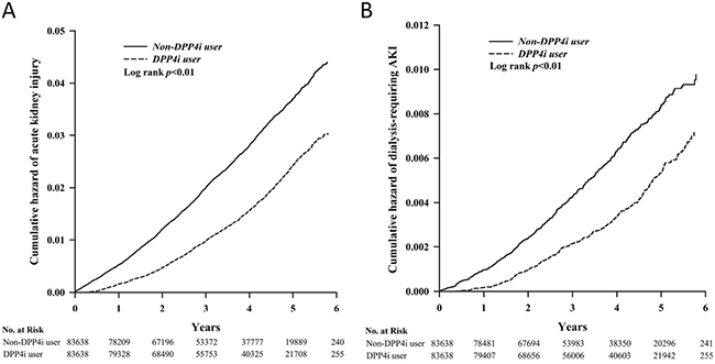 Figure 2: Kaplan-Meier cumulative hazard curve for incident AKI (A) and incident dialysis-requiring AKI (B) among study participants. AKI, acute kidney injury; DPP4i, dipeptidyl peptidase 4 inhibitor.