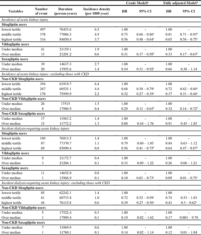 The renal effect of conventional anti-diabetic medications has been evaluated intensively. A meta-analysis suggested that treatment with thiazolidinediones significantly attenuates the severity of albuminuria among users, while metformin and sulfonylurea have no such effect [12]. However, few studies have evaluated the renal effect of newer anti-diabetic medications, including DPP4i, and the existing reports focus mostly on albuminuria. Sitagliptin, alogliptin, and linagliptin use has been linked to a 16% to 30% lower urine albumin-to-creatinine ratio over four to 24 weeks, depending on the concurrent use of ARBs [10, 13]. Although DPP4i may ameliorate albuminuria in diabetic patients, clinical trials listing renal progression as the safety endpoint found minimal evidence for the renal benefits of DPP4i use. Furthermore, existing DPP4i-related studies rarely evaluate AKI as a primary endpoint. The findings from our nationwide cohort study contribute significantly to filling this knowledge gap by demonstrating the beneficial effect of DPP4i on the risk of AKI among patients with DM.