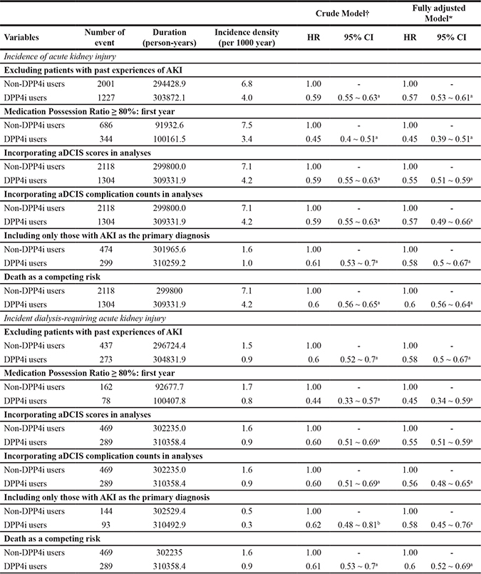 Several post-hoc sensitivity analyses were done to validate our findings. First, we focused on those without past experiences of AKI to exclude the influence of prevalent cases. We found that DPP4i users without prior AKI still had significantly lower risk of developing incident AKI (HR 0.57, 95% CI 0.5 to 0.67) and incident dialysis-requiring AKI (HR 0.58, 95 CI 0.5 to 0.67) than non-users (Table 4). We also analysed only those with a MPR ≥ 80% during the first year after study entry, to restrict our analysis to continuous DPP4i users only. We found that among those with a MPR ≥ 80%, DPP4i users still had a significantly lower risk of developing incident AKI (HR 0.45, 95% CI 0.39–0.51) and incident dialysis-requiring AKI (HR 0.45, 95% CI 0.34 to 0.59), compared to non-users (Table 4). Accounting for diabetic severity by incorporating aDCIS scores in the Cox regression model, DPP4i users also had a significantly lower risk of developing incident AKI (HR 0.55, 95% CI 0.51–0.59) and incident dialysis-requiring AKI (HR 0.55, 95% CI 0.51–0.59) compared to non-users. Incorporating aDCIS complication counts in the Cox regression model yielded similar findings (for incident AKI, HR 0.57, 95% CI 0.49–0.66; for incident dialysis-requiring AKI, HR 0.56, 95% CI 0.48–0.65) compared to non-users (Table 4). If we focused only on those with a primary diagnosis of AKI as the outcome of interest, DPP4i users also had a significantly lower risk of developing incident AKI (HR 0.58, 95% CI 0.5 to 0.67) and incident dialysis-requiring AKI (HR 0.58, 95% CI 0.45–0.76), compared to non-users (Table 4). If we incorporated mortality as a competing risk in the Cox regression analyses, DPP4i users had a significantly lower risk of developing incident AKI (HR 0.6, 95% CI 0.56–0.64) and incident dialysis-requiring AKI (HR 0.6, 95% CI 0.52–0.69), compared to non-users (Table 4). Finally, if we included only those without CKD codes in our analyses, DPP4i users also had a significantly lower risk of developing incident AKI (HR 0.56, 95% CI 0.52–0.61) and incident dialysis-requiring AKI (HR 0.61, 95% CI 0.51–0.73), compared to non-users.