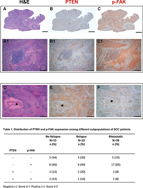 Figure 1: PTEN and phospho-FAK are negatively correlated in metastatic SCC cancer samples. Serial histologic sections of a representative human SCC biopsy stained by Hematoxylin-Eosin (A) and immunostained with specific antibodies to document the absence of PTEN expression (B) and the presence of p-FAK (C, brownish) in neoplastic tissue. Higher magnification of the same samples are shown on corresponding panels in A1–C1. (D–F) Serial sections of a SCC sample to illustrate in the same microscopic field stained by Hematoxylin-Eosin (D), PTEN positive (E, brownish) and p-FAK negative (F) cancer cells surrounding an arteriole (⋆). Scale bars: (A–C)2 mm; (A1–C1) 200 μm; (D–F) 500 μm.