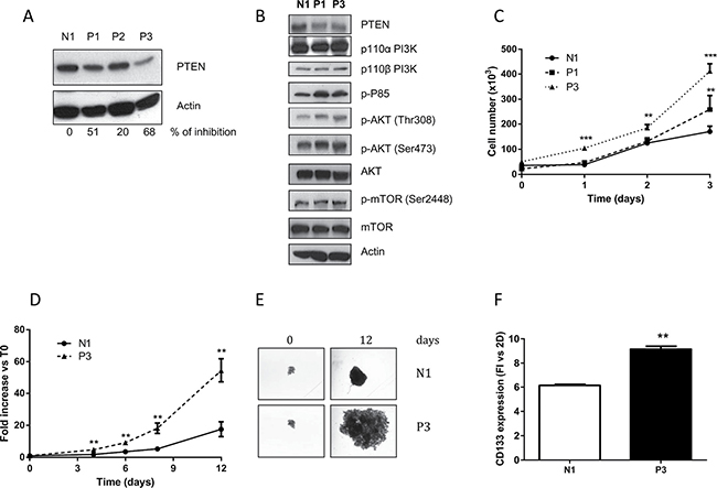 Figure 2: Reduction of PTEN increases AKT phosphorylation and growth rate in 2D and 3D models. (A) Clones generated from SKMES-1 cells after transfection with a pool of four different miRNAs directed to PTEN mRNA were tested for PTEN protein level. The cells were lysed and levels of PTEN and β-actin were determined by immunoblotting with the specific antibodies for the targets reported in each row. The immunoreactive spots were quantified by densitometric analysis, and the calculated values for the ratio of PTEN/Actin were expressed as % of inhibion of PTEN expression. (B) Western blotting showing levels of PTEN, PI3K subunits p110 α and β, p85, AKT and mTOR in total lysates from N1 and clones P1 and P3. (C) Growth rate curves of N1 and P1-P3 clones at the indicated time intervals. (D) At the indicated times, the volume of spheroids from N1 and P3 was measured and the Fold Increase (FI) index was calculated as the ratio between the spheroid volume after 4–6–8 and 12 days and the volume at T0. (E) Representative images of spheroids from N1 and P3 clones at T0 and after 12 days of culture. (F) Expression level of CD133 protein in spheroids from N1 and P3 clones was evaluated by flow cytometry and the quantification is reported as fold increase versus 2D for N1 and P3 cells. The results in A, B, E are from representative experiments. Each experiment, repeated three times, yielded similar results. Experiments in C and D are the mean value (±SD) of three independent measurements. **p < 0.01; ***p < 0.001.