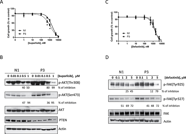 Figure 4: Buparlisib and defactinib have similar effects in inhibiting cell growth in N1 and P3 cells. (A) N1 and P3 cells were treated with increasing concentrations of the pan PI3K inhibitor buparlisib and cell growth was determined by SRB assay. (B) Western blot analysis of AKT phoshporylation in N1 and P3 cells treated for 8 h with buparlisib at the indicated dose range. (C) N1 and P3 cells were treated with increased concentrations of the FAK inhibitor defactinib and cell growth was determined by SRB assay. (D) Western blot analysis of FAK phosphorylation in N1 and P3 cells treated for 24 h with defactinib at the indicated dose range. The results in B and D are from representative experiments. Each experiment, repeated three times, yielded similar results. Experiments in A and C are the mean value (± SD) of three independent measurements. *p < 0.05.