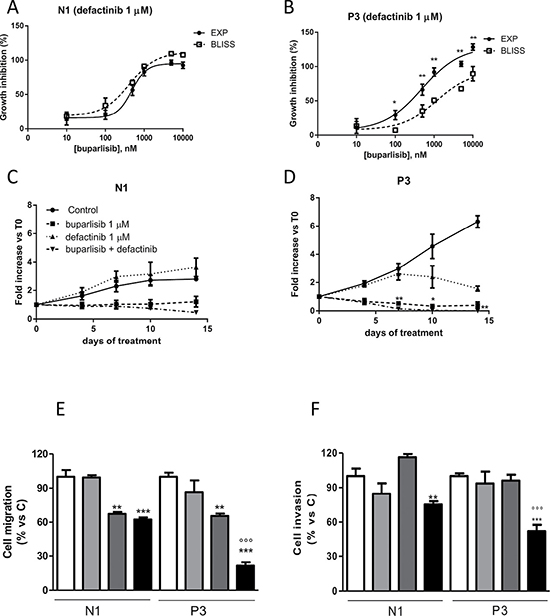 Since buparlisib or defactinib alone appeared to be weakly effective in both clones, we investigated the effect of a combined treatment. Specifically, we performed a dose-response curve of buparlisib in the presence of constant 1 μM concentration of defactinib. To evaluate the nature of the interactions, we used the Bliss interaction model. As shown in Figure 5A, the combination of the two compounds induced a weak additive effect on the inhibition of N1 cells growth, but was synergistic in P1 and P3 clones (Supplementary Figure 1 and Figure 5B). To confirm the efficacy of this drug combination, we also calculated the combination index CI [22]. As shown in Supplementary Figure 2, the concomitant drug administration resulted in a synergistic effect in P3 cells (CI<1), whereas an additive-antagonistic interaction was observed in N1 cells, with CI values above 2. Similar results were found for the other clone P1 (data not shown).