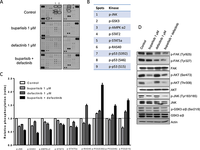 Figure 6: Combination of buparlisib and defactinib reduced phosphorylation of critical intracellular kinases. (A) P3 cells were treated with the indicated doses of drugs for 24 h and lysates were incubated with human phospho-kinase array membranes and bound phospho-proteins were detected according to kit instructions. Each membrane contains specific kinase and positive control antibodies spotted in duplicate. (B) Six proteins (JNK, GSK3, AMPK-α2, STAT2, STAT5a, RAS40) exhibited a significant decrease in their phosphorylation status and p53 protein exhibited increased phosphorylation at three different serine residues following combination treatment vs single doses. (C) Columns, means of relative levels of protein phosphorylation of duplicate spots from a single experiment. (D) Western blot analysis of lysates from P3 cells treated with buparlisib, defactinib or combination for 24 h at indicated concentrations. Experiments in A are the mean values (±SD) of two independent measurements. The results in D are from a representative experiment.