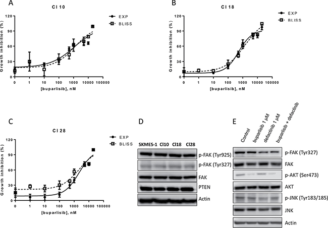 Figure 7: Combination of buparlisib and defactinib is additive in SKMES-1 derived clones with PI3K activating mutations. (A–C) Curves of growth-inhibitory effects of buparlisib and defactinib combined treatment versus theoretical Bliss additivity curve were reported for Cl 10, Cl 18 and Cl 28. In the combined treatment, defactinib was 1 μM. Cells were treated with the drugs for 3 days and then cell growth was assessed using SRB assay staining as described in Materials and Methods Section. Data are expressed as percent inhibition of cell proliferation versus control cells. The experiments, repeated three times, yielded similar results. (D) Western blot analysis of lysates from CI 10, Cl 18 and Cl 28 clones. Cells were seeded and after 24 h the medium was changed and maintened for 1 day. At the end, cells were lysed and the indicated protein levels were detected by Western blot analysis. (E) Western blot analysis of lysates from Cl 18 cells treated with buparlisib, defactinib or combination for 24 h at indicated concentrations. Experiments in A-C are the mean value of two independent measurements (±SD). The results in D-E are from a representative experiment.