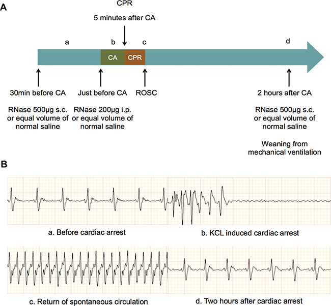 Figure 1: Schematic outline of cardiac arrest and cardiopulmonary resuscitation and ECGs in different stages during cardiac arrest and cardiopulmonary resuscitation procedure. (A) Schematic outline of CA and CPR and RNase administration. (B) ECGs in four stages during CA and CPR: before CA (a), potassium chloride induced CA (b), ROSC (c) and two hours after CA (d). CA, cardiac arrest; CPR, cardiopulmonary resuscitation; ROSC, return of spontaneous circulation.