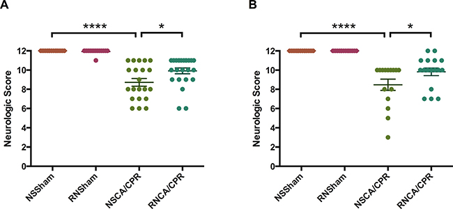 Figure 2: Neurologic score on day 1 (A) and day 3 (B) after successful resuscitation. Neurological function was evaluated from 6 aspects: consciousness, corneal reflex, righting reflex, respiratory model, coordination and movement. Each item valued 2 points and the maximum score was 12 points. (A) Mean neurologic scores on day 1 after successful resuscitation in four groups. (B) Mean neurologic scores on day 3 after successful resuscitation in four groups. *P < 0.05, ****P < 0.0001. Data are presented as mean ± SEM (n = 29 per CA/CPR group, n = 14 per sham group). CA/CPR, cardiac arrest and cardiopulmonary resuscitation; NSSham, sham plus normal saline; RNSham, sham plus RNase; NSCA/CPR, CA/CPR plus normal saline; RNCA/CPR, CA/CPR plus RNase.