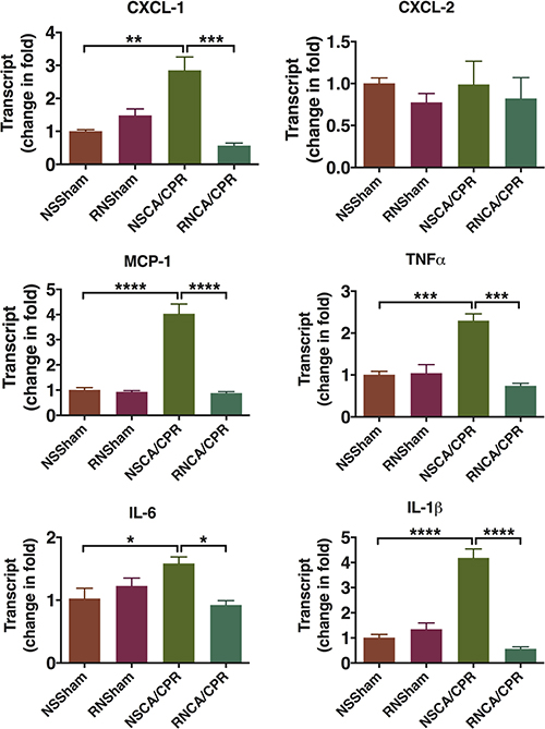 CA/CPR performance significantly increased the expressions of chemokine (C-X-C motif) ligand 1 (CXCL-1) and monocyte chemotactic protein 1 (MCP-1) at mRNA level in hippocampus tissue on day 3 after CPR compared to the sham groups (Figure 4, **P < 0.01, ****P < 0.0001). In addition, this increase could be significantly reduced by RNase administration (Figure 4, ***P < 0.001, ****P < 0.0001). The expressions of cytokine chemokine (C-X-C motif) ligand 2 (CXCL-2) were similar among the four groups. Inflammatory cytokines, including tumor necrosis factor α (TNFα), IL-6 and interleukin-1β (IL-1β), were also significantly increased in the NSCA/CPR group compared to that of the NSSham group. And the inflammatory cytokines were decreased significantly by RNase treatment in mice underwent CA/CPR (Figure 4, *P < 0.05, ***P < 0.001, ****P < 0.0001). There were no differences between the RNSham group and the NSSham group. This result suggested RNase administration could reduce inflammatory response on day 3 after CA/CPR.