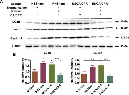 Protein level of autophagy markers, including protein light chain-3 B (LC3B) and Beclin-1, were dramatically increased on day 3 after CA/CPR in hippocampus tissue of mice compared with the NSSham group. This kind of increasing level of autophagy markers could be significantly reduced by RNase administration (Figure 5, ***P < 0.001), suggesting RNase administration could alleviate CA/CPR-induced increased level of cellular autophagy. Interestingly, autophagy markers were increased in the RNSham group compared to that of the NSSham group, indicating that RNase itself could also increase cell autophagy baseline level as an exogenous stimulation.