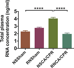 Figure 7: RNase treatment reduced total plasma RNA concentration on day 3 after cardiac arrest and cardiopulmonary resuscitation. The concentrations of total plasma RNA were measured on day 3 after modeling in four groups. Concentrations of total plasma RNA were compared among all the four groups. Data are presented as mean ± SEM (n = 6 per group). ****P < 0.0001. CA/CPR, cardiac arrest and cardiopulmonary resuscitation; NSSham, sham plus normal saline; RNSham, sham plus RNase; NSCA/CPR, CA/CPR plus normal saline; RNCA/CPR, CA/CPR plus RNase.