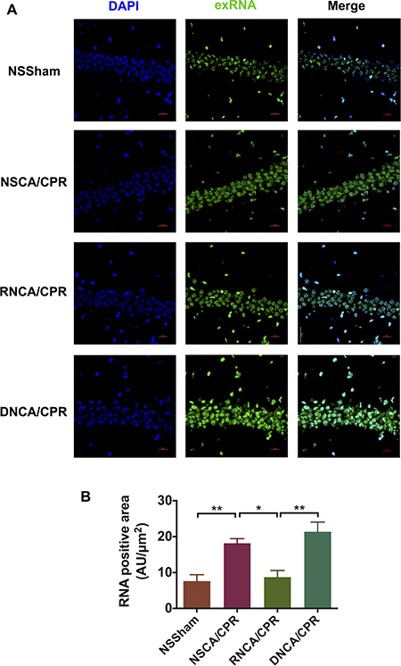 On day 3 after CA/CPR or sham surgery procedure, mouse brain tissue was collected after anesthesia, put into liquid nitrogen as soon as possible, and kept at −80°C. Frozen brain tissue was cut into 30 μm-thick frozen sections. Frozen sections were fixed with methanol for 1 hour at 4°C and then washed by PBS. Brain frozen sections were stained by SYTO® RNASelect™ Green Flourescent Cell Stain (S32703, Molecular Probes, USA) for 20 minutes at 37°C and washed by PBS. DAPI was used to stain cellular nuclei. Confocal microscope (A1RMP+, Nikon, Japan) was used to detect fluorescent intensity of exRNA in hippocampus tissue with three filters under high magnification (600×). Quantification the exRNA staining was performed in three microscopic fields (600×) each section in a blinded way.
