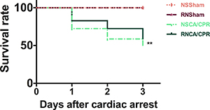 Figure 9: Survival rates within 3 days in different groups. Observation period was 3 days after CA/CPR procedure (n = 29 per CA/CPR group, n = 14 per sham group). **P < 0.01, NSCA/CPR group vs. NSSham group. CA/CPR, cardiac arrest and cardiopulmonary resuscitation; NSSham, sham plus normal saline; RNSham, sham plus RNase; NSCA/CPR, CA/CPR plus normal saline; RNCA/CPR, CA/CPR plus RNase.