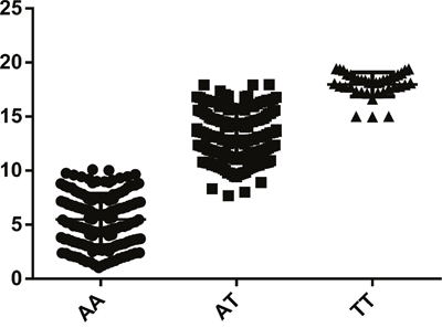 As shown in Table 2, GLUT1 rs710218 was evidently associated with increased CRC risk. Under multivariable logistic regression model adjusted for age, gender, smoking status, drinking status, body mass index, and waist-hip-ratio, individuals with TT genotype (OR = 1.68, 95% CI = 1.02-2.75, P = 0.041) or AT genotype (OR = 1.47, 95% CI = 1.09-1.99, P = 0.012) of rs710218 had a significantly increased risk of CRC compared to those with AA homozygote. In dominant model, TT genotype was significant associated with increased CRC risk (OR = 1.51, 95% CI = 1.13-2.00, P = 0.005). Likewise, positive outcome was found in the additive models, with per-T-allele OR of 1.37 (95% CI = 1.09-1.71, P = 0.006). Results of Figure 3, which presents comparison between rs710218 and GLUT1 expression, also indicated that T allele was significantly associated with higher GLUT1 expression (P<0.001) and then contributed to CRC risk.