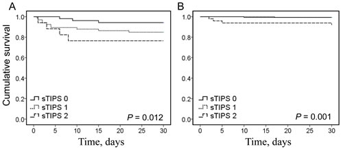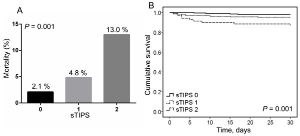 Data were calculated as frequencies and percentages for categorical variables, and as mean ±SD for continuous variables (normal distribution) or median and interquartile ranges (abnormal distribution). Patient characteristics were compared based on sTIPS values. Parametric patient characteristics were compared using a one-way ANOVA, whereas nonparametric characteristics were compared using the Kruskal-Wallis H test. Categorical data were compared using the chi-square (χ2) test. Kaplan-Meier curves were constructed and stratified according to sTIPS. Cox proportional hazards models were used to investigate the relationship between sTIPS and time-to-mortality during hospitalization. To construct the Cox model, univariate Cox regression for each predicting variable was performed, with all-cause mortality as the outcome variable. Variables that were found to be significant (P < 0.05) on univariate Cox models were then entered into a multivariable Cox model. From the multivariable model, we identified variables that were significant (P < 0.05) predictors of mortality. Data analysis was performed using SPSS Statistics for Windows, Version 21.0 (Chicago, IL, USA: SPSS Inc.).