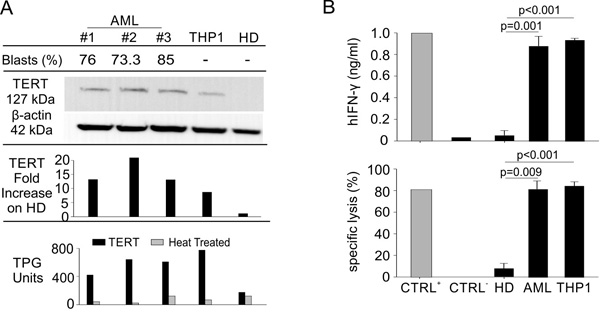 Figure 1: Engineered hTERT865-873-specific T-cells selectively recognize HLA-A2+ acute myeloid leukemia in vitro. A. Percentage of leukemic blasts, telomerase expression (WB and lane quantification normalized on β-actin) and enzymatic activity levels in THP1 cell line, PBMCs from AML patients and age-matched HDs (representative cases out of 10 AML patients and 4 HDs are shown). B. AML leukemic cells were recognized in vitro by engineered hTERT865-873-specific T-cells upon 24-hour co-culture, as assayed both by hIFN-γ release assay (upper panel) and flow cytometry cytotoxicity assay (lower panel). Data are mean ± SD of three independent experiments: hTERT865-873 pulsed HLA-A2+ HD PBMCs (n = 3; CTRL+); hHCV1406-1415-pulsed HLA-A2+ HD PBMCs (n = 3; CTRL-); HLA-A2+ HD PBMCs (n = 4); HLA-A2+ PBMCs from AML patients (n = 10); THP1 cell line (n = 3). Statistical analysis was performed with ANOVA test.