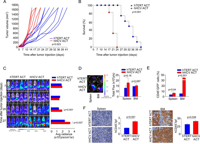 Figure 2: Engineered hTERT865-873-specific T-cells selectively recognize HLA-A2+ acute myeloid leukemia in vivo. A. Assessment of hTERT-specific ACT capability to ameliorate mouse survival upon THP1-Luc subcutaneous challenge. Either hTERT865-873- or HCV1406-1415-TCR-engineered T cell were transferred twice, followed by the i.p. administration of IL-2 to test the ability to control tumor growth. B. Kaplan-Meier survival analysis (hTERT n = 8; hHCV n = 6) of a representative experiment. C. NOG mice were then intravenously injected with THP1-Luc cells and treated with three, weekly ACTs of hTERT865-873-specific or control HCV1406-1415-specific T-cells (representative data of 1 out of 2 independent experiments of total n = 12 mice per group). Tumor growth was weekly evaluated by bioluminescence imaging. D. At 27 days from tumor-challenge, leukemic cells spread to spleen and BM was tested by bioluminescence imaging. E. The percentage of infiltrating malignant hCD45+ cells was also evaluated by Flow cytometric analysis and F. by IHC (20X magnification). Statistical analysis was performed with Student’s t test.