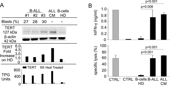 Figure 3: Engineered hTERT865-873-specific T-cells selectively recognize HLA-A2+ acute lymphoblastic leukemia in vitro. A. Percentage of leukemic blasts, telomerase expression (WB and lane quantification normalized on β-actin) and enzymatic activity levels in ALL-CM cell line, B-cells isolated from PBMCs of B-ALL patients and age-matched HDs (shown some representative cases out of 10 B-ALL patients and 5 HDs). B. Leukemic cells isolated from B-ALL patients were recognized in vitro by engineered hTERT865-873-specific T-cells upon 24-hour co-culture, as assayed both by hIFN-γ release assay (upper panel) and flow cytometry cytotoxicity assay (lower panel). Data are mean ± SD of three independent experiments: hTERT865-873 pulsed HLA-A2+ HD B-cells (n = 3; CTRL+); hHCV1406-1415-pulsed HLA-A2+ HD B-cells (n = 3; CTRL-); HLA-A2+ HD B-cells (n = 5); HLA-A2+ B-cells from B-ALL patients (n = 10); ALL-CM cell line (n = 3). Statistical analysis was performed with ANOVA test.