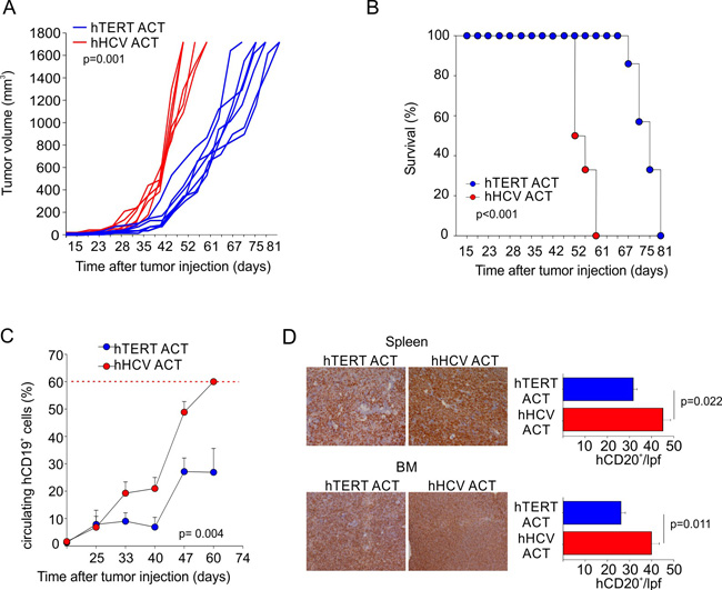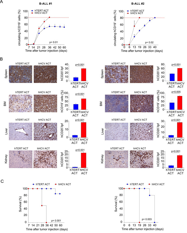 Figure 5: Engineered hTERT865-873-specific T-cells restrain human acute leukemia progression. NOG mice were challenged with PBMCs isolated from two different HLA-A2+ B-ALL patients (B-ALL#1 and B-ALL#2). Mice were treated with 3 weekly ACTs of hTERT865-873- or hHCV1406-1415-specific T-cells, followed by IL-2 administration. A. Tumor progression was calculated evaluating circulating human B-cells. Mice where sacrificed when control mice showed around 80% of circulating malignant cells (red dotted line). B. IHC analysis of hCD20 expression in spleen, BM, liver and kidney (20X magnification). Only for BM (40X magnification), quantification was obtained by flow cytometric analysis. Data are mean ± SD. Statistical analysis was performed with Student’s t test (n = 5 per group). C. Survival follow up of the remaining treated mice (B-ALL#1, hTERT n = 7 , hHCV n = 5 ; B-ALL#2 hTERT n = 5 , hHCV n = 4). Kaplan-Meier survival analysis: B-ALL#1, hTERT ACT vs. hHCV ACT: p = 0.001; B-ALL#2, hTERT ACT vs. hHCV ACT: p = 0.003.