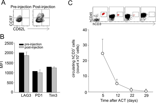 Figure 6: Phenotype and persistence of transferred T-cells in vivo. A. hTERT865-873-specific T cells showed an effector memory phenotype (CD62L-CCR7-) before and 4 days after in vivo administration in leukemic mice. Data show representative contour plots. B. Analysis of engineered T cell inhibition markers (LAG3, PD1 and Tim3) pre-injection and 4 days post-injection in leukemic mice. C. Evaluation of circulating TERT-specific T cells at different time points after adoptive transfer in leukemic mice. Representative dot-plots are shown.