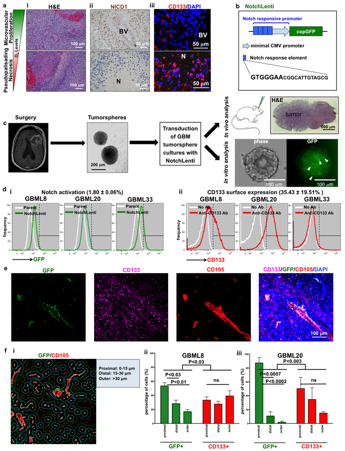 Figure 1: Notch activation and CD133 cell surface expression show differential intratumoral localization in human GBM. a., i. H&E reveals areas of microvascular proliferation (top panel) and PPN (bottom panel) within the same human GBM biospecimen. a., ii. Nuclear NICD1 immunoreactivity is seen in perivascular areas but not in PPN regions. a., iii. In contrast, CD133 immunoreactivity is seen in both microenvironments. b. Schematic of the lentiviral vector used to monitor Notch pathway activation. The 20 bp-long Notch response element contains a consensus GTGGGAA site found in Notch transcriptional targets. c. Schematic depicting the approach for obtaining patient-derived primary tumorsphere cultures and orthotopic tumor xenografts after transduction with NotchLenti. Scattered Notch-activated (GFP+) cells (arrowheads) were observed in tumorspheres in vitro. d. Flow cytometry histograms of GBM lines show gradients of (i) increased GFP fluorescence after transduction with NotchLenti and (ii) CD133 immunoreactivity after incubation with anti-CD133 antibody (n = 3 primary cultures). e. Immunofluorescent analysis of xenograft tumors generated by GBML8 cells modified with NotchLenti reveals perivascular GFP staining for Notch activation. f. Quantification of the distance of GFP+ or CD133-expressing cells from the vasculature (i) in xenograft tumors generated with 2 patient-derived cultures already modified with NotchLenti shows that GFP+ cells prefer a perivascular localization. (n = 3 animals for each condition, ii: GBML8: ANOVA, F(2,8) = 16.93, P < 0.003 and iii: GBML20: ANOVA, F(2,8) = 6.049, P < 0.03). H&E: hematoxylin and eosin; N: necrosis; BV: Blood vessel; CMV: Cytomegalovirus; GFP: Green Fluorescence Protein; CD105: Endoglin; DAPI: nuclear counter stain; ns: not significant.