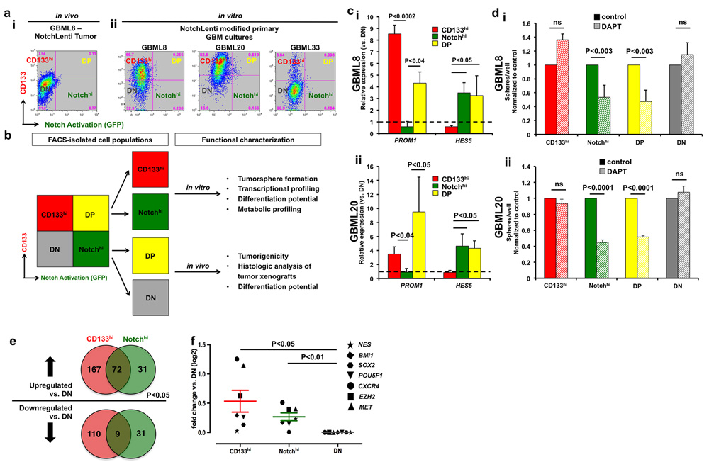 Figure 2: Segregation of Notchhi and CD133hi cell populations. a., i Flow cytometric analysis of an intracranial tumor xenograft derived from GBML8-NotchLenti cells shows the segregation of CD133 expression (CD133hi) and Notch activation (Notchhi). a., ii Flow cytometric analysis of cell surface CD133 and Notch activation (GFP reporter) in 3 primary cultures in vitro shows that there is only partial overlap between the two markers. For the analysis in a., GFP gates were drawn based on parental cultures not transduced with NotchLenti, and CD133 gates were based on control conditions without antibody (as shown in Supplementary Figure 2c). b. Experimental plan for studying Notchhi and CD133hi cells. c. FACS-sorted CD133hi, Notchhi and DP cells were compared to DN cells for CD133 (PROM1) and HES5 mRNA expression by qPCR. The experiment was performed on two different primary cultures transduced with NotchLenti: (i) GBML8, and (ii) GBML20 (n = 3 FACS experiments/primary cell line, t-tests, P < 0.05). d. After FACS isolation, cells were seeded at low density (10 cells/μl) and tumorsphere formation was analyzed 7 days after isolation. Only Notch-activated populations (Notchhi and DP) showed decreased tumorsphere formation upon pharmacological inhibition of the Notch pathway with 10 µM DAPT in 2 cultures: (i) GBML8: ANOVA, F(7,14) = 9.472, P < 0.0002, (ii) GBML20: ANOVA, F(1.4) = 74.98, P < 0.001) (n = 3 experiments/primary cell line). e. To further confirm CD133hi and Notchhi cells represent distinct populations in GBM, we performed RNA-seq from FACS isolated cells from GBML8 and GBML20. RNA sequencing revealed 420 genes that were differentially expressed in CD133hi and Notchhi GSCs compared to DN cells (P < 0.05). f. When the RNA-seq data were analyzed for known GSC markers, CD133hi and Notchhi cells showed enrichment for these transcripts compared to the DN population (n = 7 genes, ANOVA F(1, 6) = 7.490, P < 0.03). ns: not significant.